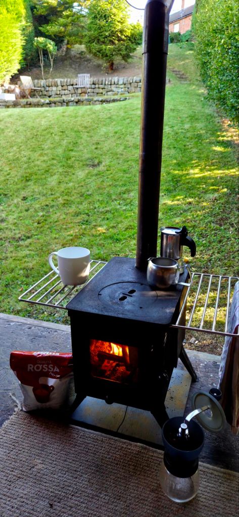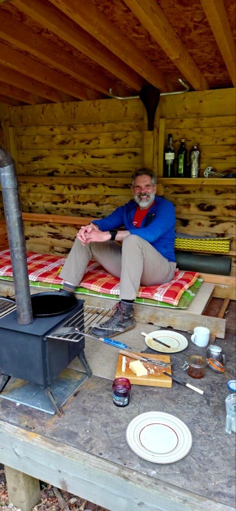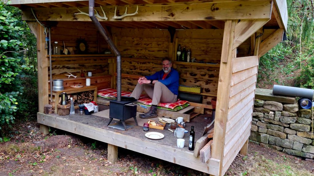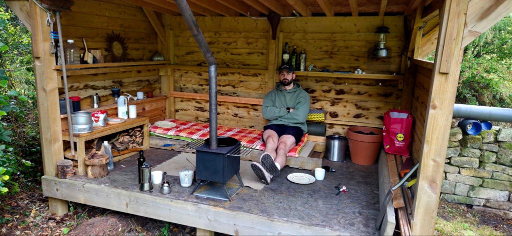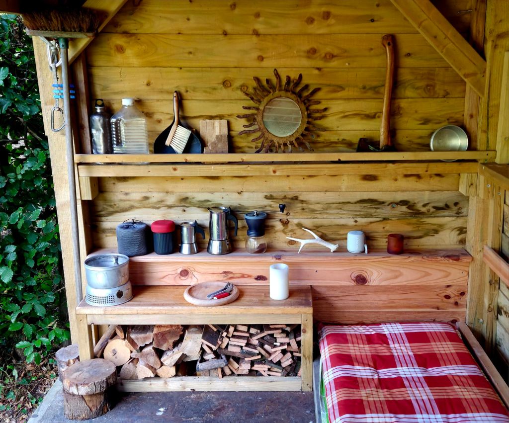 Consolations of the forest – Sylvain TessonThis bivi spot in the garden catches prevailing weather and is overlookedAha… dead shed20 Feb ’21The Larch roots toppled the old shed… … and have to be accounted for in siting the cabin legs – 15 Mar – tamped gravel into bottom of hole, laid piece of green driveway grid, stood post on that and tamped gravel around – i cooked this idea up in an attempt to avoid standing water rotting the posts21 Mar ’21… just enough for a test night-out9 Apr – roof & floor12 Apr – end wall with removable upper half for summer14 Apr – back wall with removable upper sections… for summer nosinessesdear trophy Pond liner + rootproof membrane – planning green roof (when I’ve sussed the detail)Feather-edge boards15 Jul post-ride brew… with my boy Alex10 Jul29 Nov26 May ’22 – view from the shed/hut/cabinThere’s a wife in thereCoffee in the hammock13 Oct ’22 – testing the new tipi-stove‘nother night ootGuests – Rach & Jenny21 Oct – added an end wall/windowPrototype day bed… and night bed obvs7 Nov 229th NovMild pleasant warm November so farAfter a sesh at ScuggyDan Sep 25Alex Sep 25