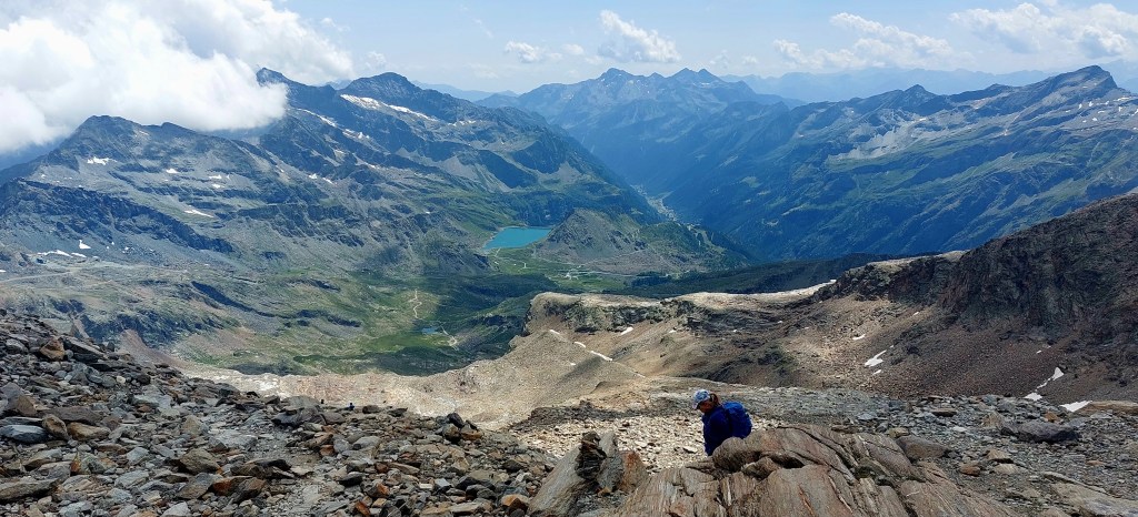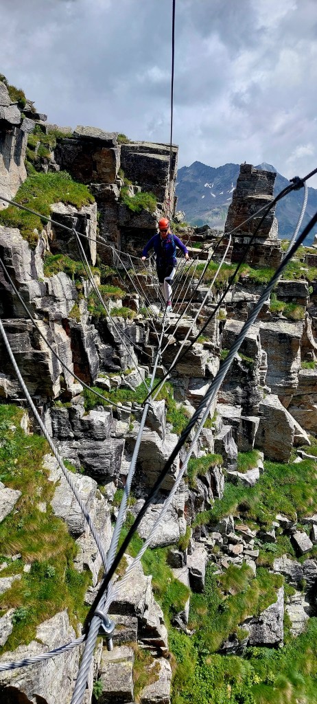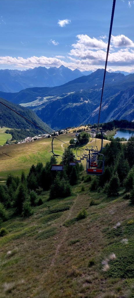 Followed route 3 to Rifugio for no lunch (too busy with bookings) so ate our selection of cold meats and cheeses and had a giant snooze among the boulders and alpines for an hour. Previous excursions up the glacier and peaks on the right visible from this vantage.Got back to Santuario and somehow didn’t notice the chair grind to a halt so had to bezz downhill like fellrunners/idiots to catch the next chair and complete the chain to the valley – phew
