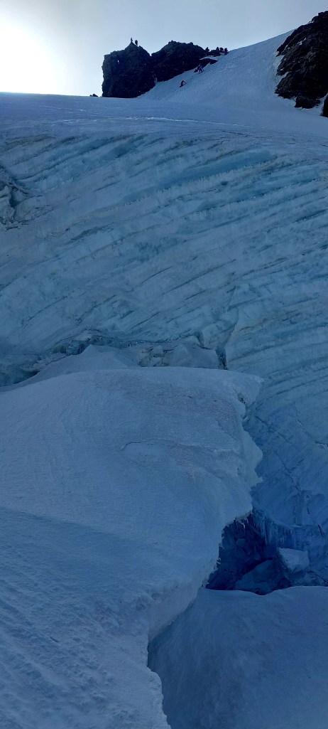 The contrast was of continual interestFelt much better so took in some 4,000ers on the way down – first one being Punta Parrot Punta Parrot summit 4,434mDescending Ludwigshöhe 4,343mCrevasses beneath Corno NeroDescending from Bivacco Giordano on the Balmenhorn 4,167mThe south face of Lyksamm and the route through the crevasses we took yesterdayDunno what this was i just liked the shapes