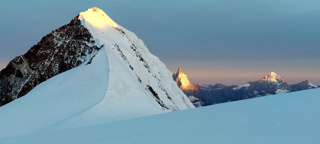 Sunrise touching Liskamm (L) & Matterhorn (R)Ginger descent of ZumsteinspitzeAssessed from summit of Zumsteinspitze 4563m, to be too cold/windy/much fresh snow/gnar, sacked off Dufour and returned