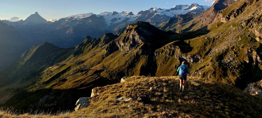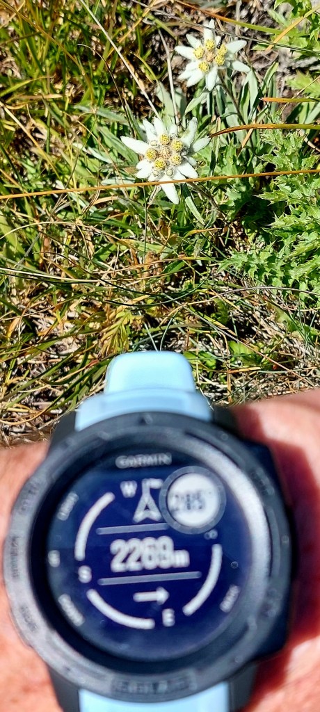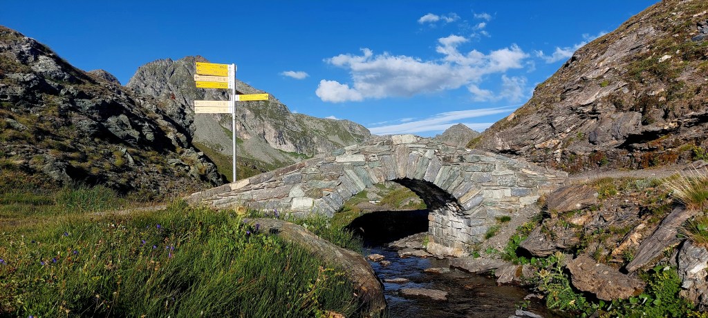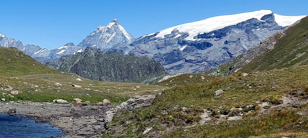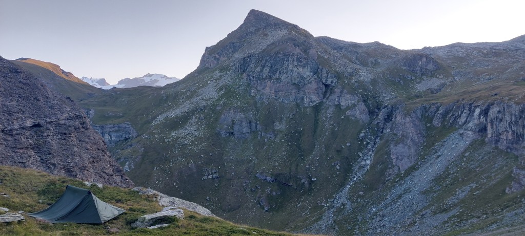 Laghi di PintaMatterhorn & BreithormSaw quite a lot of Stella Alpina (only saw one last year)Ditched kit then walked round to Rifugio Arp for meats, cheese, wine, panacotta, coffee (run out of Camping Gaz and eking out our small gas and can’t buy either within 25km)Met woman on a bike here (see Rifugio Arp framed by bridge lol) who asked are you sleeping out? Yes i said. Cool she said. Then Jenny saw that she was stalking us from a distance, so after pitching the tent struck it sharpish and continued back over the Col Palasina (wild-camping illegal in Italy and we thought she was probably from the farm that graze cattle even this high – so unlikely she actually meant cool)Further views of Monte Cervina as we searched for a stealth camp Settled for this shelf among the chamois hoofing about outside