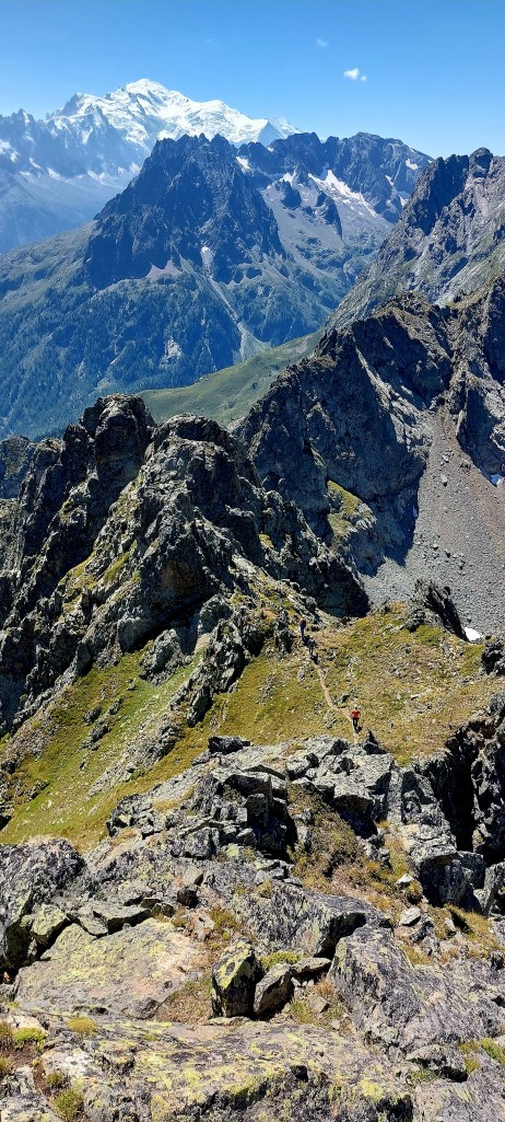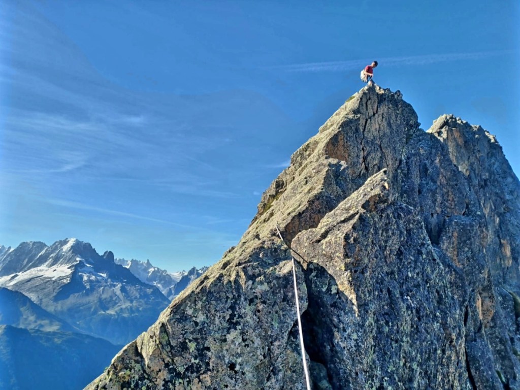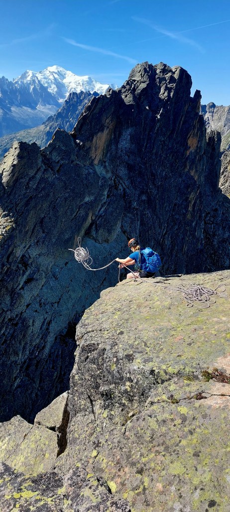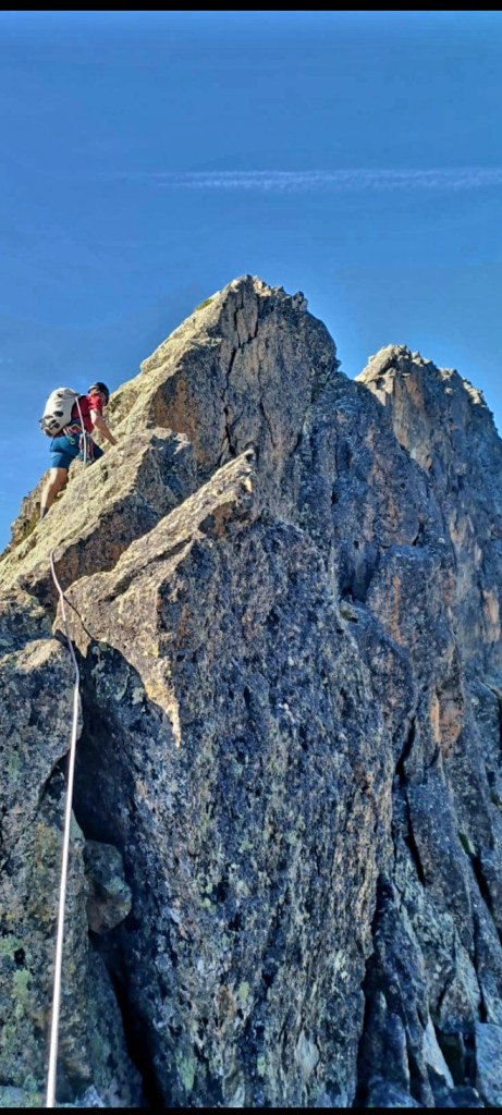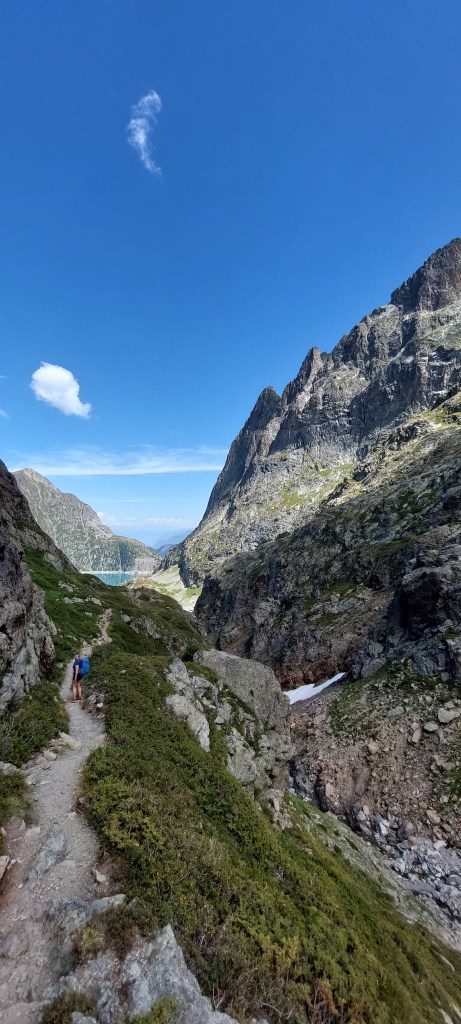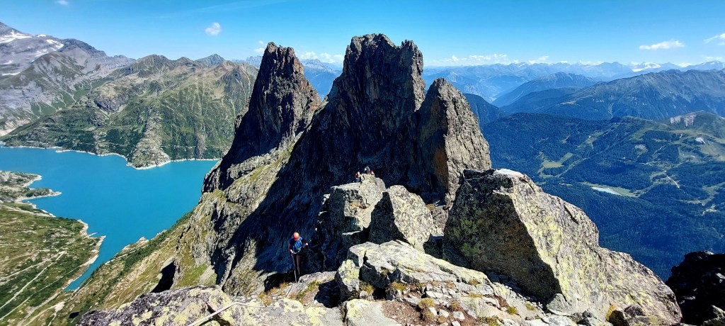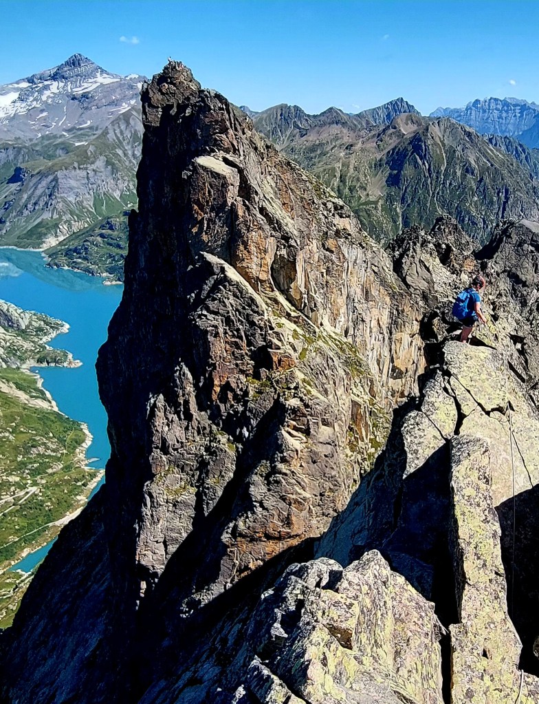 High above Lac d’Emosson (altitude, we weren’t actually high, that would be irresponsible)Jenny belay, 2 teams aheadAnother abseilJenny in the brêche, a team behindLouis basking…having reached temperature lays in wait for unsuspecting bars of white chocolateLooking back along the traverse which takes the crest of that ridgeWider shot of sameThe descent after lunch on Pointe del’Ifala 2,654m (Mt Blanc backdrop) Revived our tootsies in hereThe walk-out as spectac as the routeLong shot of the ridge above the dam