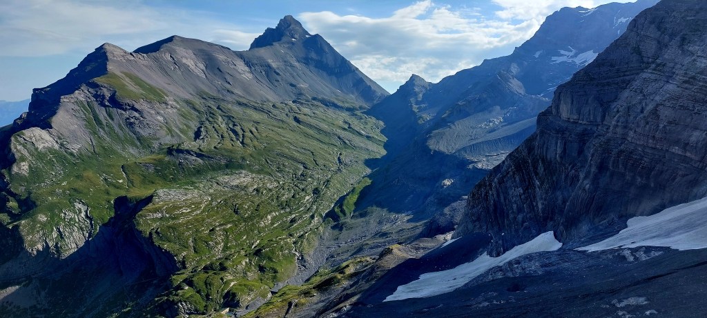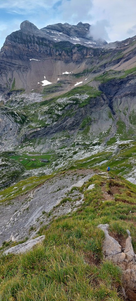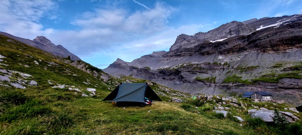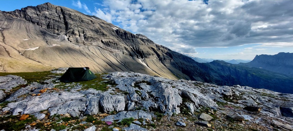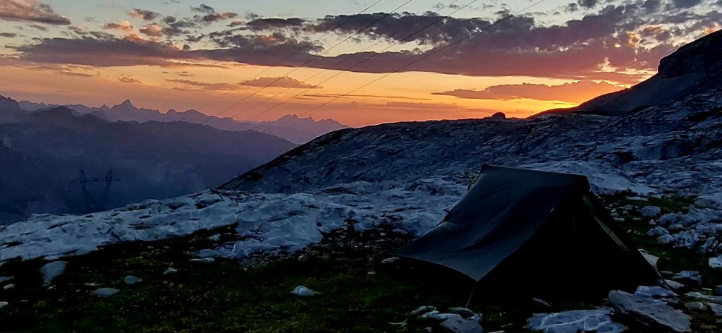View from the first of 3 col climbs – Col de Finestral (650m ascent)Col d’Emaney (606m ascent) luckily brief shower happened at top as trekking uphill in waterproof would be nasty – as it happened took it off 5 mins later anyway Cutting across the inflow of Lac SalanfeView back from Col de Susanfe (573m ascent)Camping out the back of Cabane Susanfe after wine/beer & crisps after ~20km & 1,829m ascentDay 2 and the only climb – ladders leading to Col des OttansView down SusanfeTête des Ottans 2,548mRefuge de la Vogealle in the bottomRefuge de la Vogealle – polenta et saucisses mmmm..Camping le Pelly in the Sixt valley after a day of contrasts, rugged alpine uphills, pleasant traverse then the busy valley floor ~15km & 628m ascentDay 3 and the massive limestone slabs on approach to Refuge de Grenairon – where i had Farcement (which i must make at home – potatoes slow cooked for 2hrs with dried fruit)La CathédraleCirque des FontsCamping Plan du Buet 2,530m… after ~15km & 1,910m ascentDay 4 – sunrise illuminating Rochers des FizAguille Vert, les Drus & the Mt Blanc massif from Cheval Blanc approach.. and again from Cheval Blanc summit 2,830mThe final descent to upper lac d’Emosson – the last day only ~300m ascent and 6km