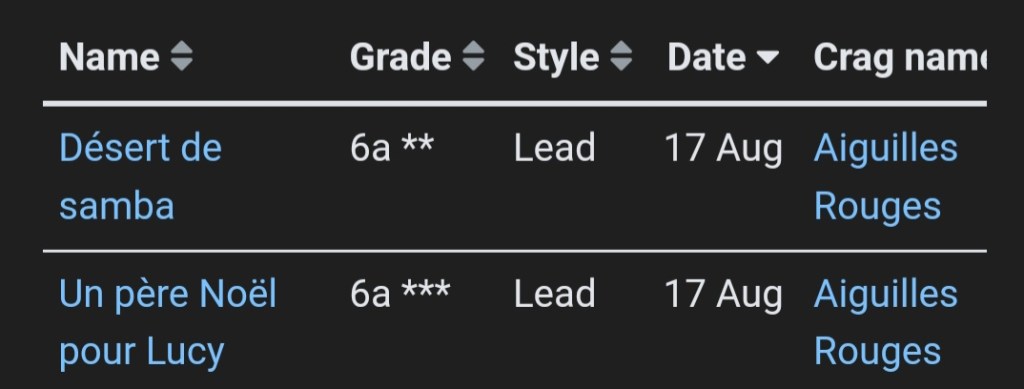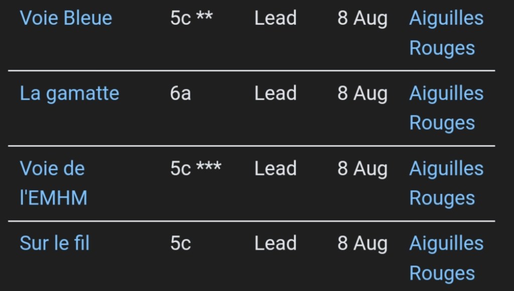 17th – Les Cheserys – 9 pitches – 5a, 5c, 5b, 6a, 6a; 5b, 5c, 6a, 5b though we felt Désert de Samba was 4a, 5c, 6a, 6a
