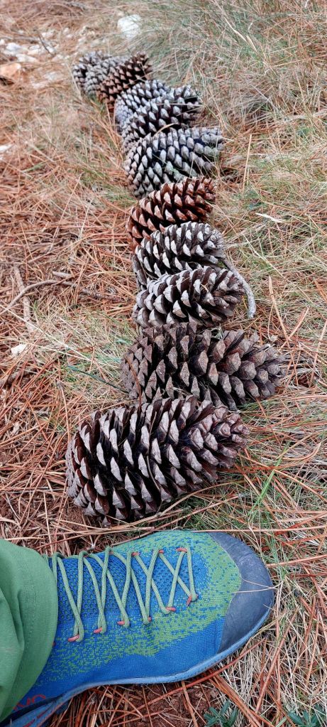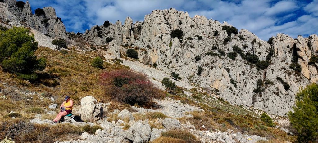 Impressive big fluffy thistley thingsImpressive big sharp limestoney thingsWater stop before summit approachPla de la Casa summit..where we had lunch – clear line on distant hills of wild-fire damage 2020 (large area of barren land beyond treeline) – also we could see Majorca and Ibiza from hereCheck their food: https://www.facebook.com/CanPinet