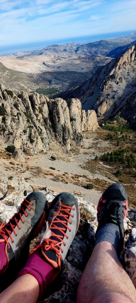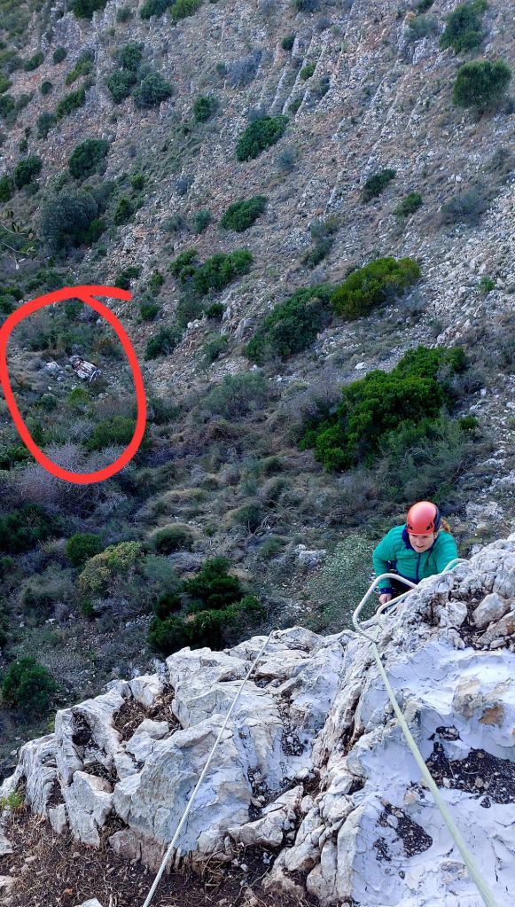No ferrata kit (actually prefer sport stylie anyway)Always wear a helmet in case someone drives off the cliff you’re climbingGot as far as spot height 692 from the yellow hairpin which took about an hour and a half there and back – doesn’t look far but steep gravelly spiky bushwhack in the shade was more fun than we signed up for..erm is that safe?